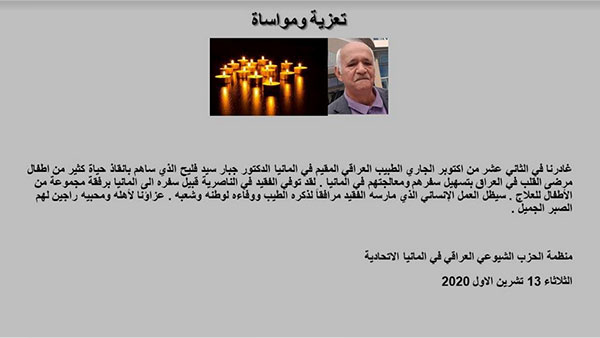تعزية منظمة الحزب في المانيا رحيل الطبيب جبار سيد فليح التفاصيل oscar محليات 14 تشرين1/أكتوبر 2020 5608 السابق التالي