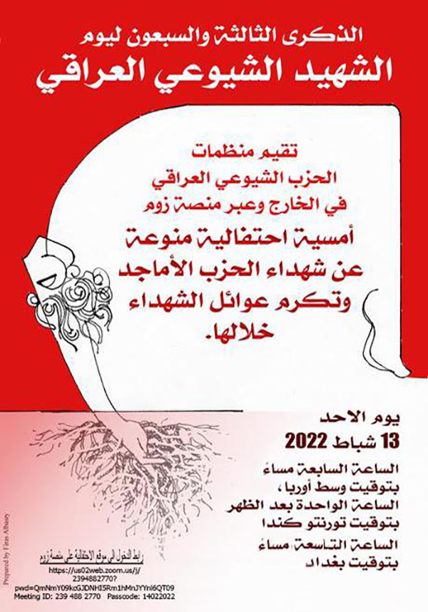 حفل منظمات الحزب خارج الوطن بالذكرى الثالثة والسبعين ليوم الشهيد الشيوعي التفاصيل قسم الاخبار محليات 11 شباط/فبراير 2022 3851 رابط الدخول إلى موقع الاحتفالية على خدمة الزوم: https://us02web.zoom.us/j/2394882770?pwd=QmNmY09kcGJDNHI5Rm1hMnJYYnl6QT09 Meeting ID: 239 488 2770 Passcode: 14022022 رابط البث المباشر للاحتفالية على حساب الحزب الشيوعي العراقي في الفيس بوك: https://www.facebook.com/iraqicp السابق التالي
