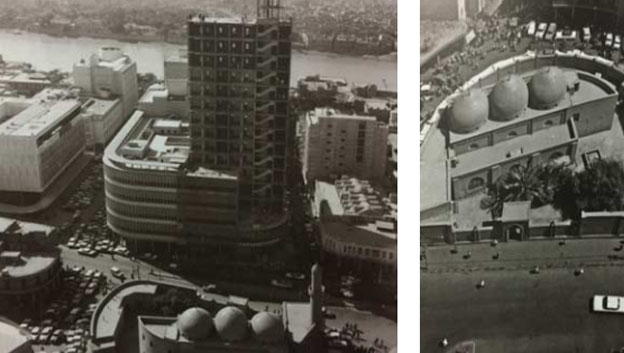 في نموذج لصورة احتوت على مجموعة بنى معمارية ( منطقة البنوك)، ركزت اللقطة على مجموعة شواهد حيث ابتدأت بعمارة البنك المركزي وما يجاورها من الأبنية ومجمعات السكن، والفاصل بين قسميّ بغداد الكرخ والرصافة هو نهر دجلة. وفي هذ التقسيم الطبيعي الذي أحيل إلى تقسيم فني ــ جمالي. هذه التشكيلة الفنية توحي بتطامن ودعة ، أي ظهرت للمياه والأنهار تأثيرات أسطورية على الأمكنة. فالنهر مكان متحرك ، يُضفي على الأمكنة التي يمر بها جمالية ودلالة ،فمياهه تعني أهم ما تعنيه الحركة والحيوية. والصورة إنما أوحت بالحركة المصرفية والتجارية التي شهدت لها أمكنة بغداد العمرانية كالأسوق مثلاً.