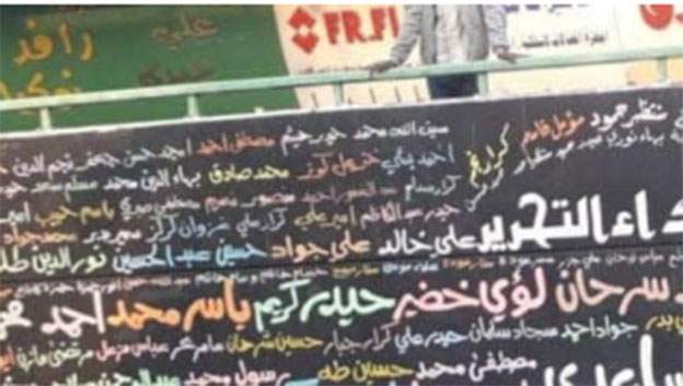 في حين قام (سجاد الخطاط) برسم زهرة كبيرة رباعية الفصوص ودون فيها اسماء الشهداء في الخط السنبلي المتعرج بشكل متقن بالصبغة الذهبية على أرضية سوداء رامزة للحزن الكامن في الأعماق، فيما كتبت الأسماء بماء الذهب نتيجة للتضحيات التي قدم فيها هؤلاء أثمن ما لديهم وهي أرواحهم، وبهذا المعنى فأن اللوحة تحمل خصوصياتها المرتبطة ببنيتي الزمان والمكان ، اذ ان اسماء الشهداء هم عراقيون وسقطوا في ساحة وسط بغداد وقد استثمر الفنان مرجعيته الجمالية العراقية من اجل تحويل اسماء مجردة الى فعل جمالي وسجل حضوره داخل ذات المتلقي، فضلا عن فضح هذه الحوادث التي تنال بشراسة من الذات العراقية المسالمة والمطالبة بحقوقها على الرغم من مظاهر الاحتجاج السلمية التي تقوم بها.