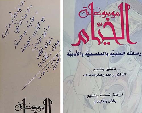 تمثل موسوعة الخيام التي حققها الباحث الايراني رحيم رضا زاده ملك وترجمها عن الفارسية الاديب الموسوعي جلال زنكابادي افضل مصدر شامل عن الشاعر الفيلسوف الرياضي عمر الخيام صدرت في العربية مؤخرا .