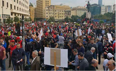 في ساحة رياض الصلح، نعى النقابي غريب اقتصاد البلد، الذي «لم يعد بعيداً عن انهيار وشيك». ورغم ذلك، تُكابر رموز النظام، عبر «الاستمرار في النهج عينه من خلال تنفيذ مقررات مؤتمر باريس 4 (سيدر)، بفرض ضرائب غير مباشرة عبر رفع الدعم عن الكهرباء، وخفض التقديمات للصناديق ومعاشات التقاعد ونظام التقاعد على موظفي الدولة، وتحجيم القطاع العام، وصرف متعاقدين، وزيادة خمسة آلاف ليرة على صفيحة البنزين، وزيادة الضريبة على القيمة المضافة إلى 15 في المائة، وفرض الخصخصة لمرافق الدولة، وعبر الاكتتاب بسندات الخزينة بفوائد مرتفعة. وكلّ ذلك لزيادة أرباح المصارف واغتناء الطغمة الحاكمة من مراكمة الريوع والعمولات والنهب المتمادي للمال العام، مع التهديد الدائم بانهيار سعر صرف الليرة».