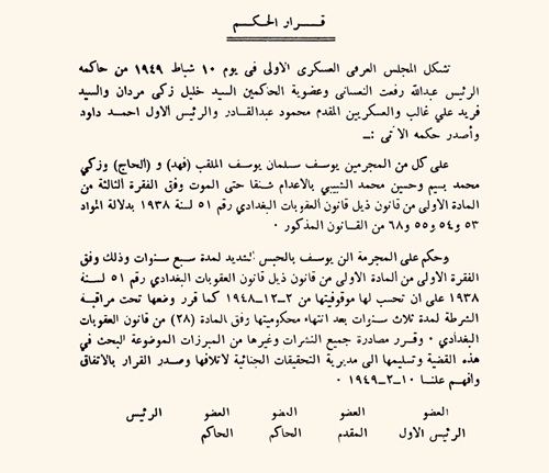 وفي غمرة نضاله المتشعب تم اعتقاله ليلة 18 يناير “كانون الثاني” من العام 1947، وتمت محاكمته هو ورفاقه وصدر ضده الحكم بالإعدام أول مرة في صيف ذلك العام، ثم استبدل بالسجن المؤبد، ثم جرت محاكمته مرة أخرى في 10 فبراير “شباط” من العام 1949 بتهمة قيادة الحزب الشيوعي العراقي من داخل السجن، وصدر الحكم عليه بالإعدام من المجلس العرفي العسكري الأولي الذي كان يرأسه عبدالله رفعت النعساني، وتم تنفيذ الحكم الجائر ليلة 14/15 فبراير “شباط” من العام 1949 ليختم حياته القصيرة في ساحات النضال من أجل تحقيق شعاره الأثير، الذي صاغه في حياته: “وطن حر وشعب سعيد”.