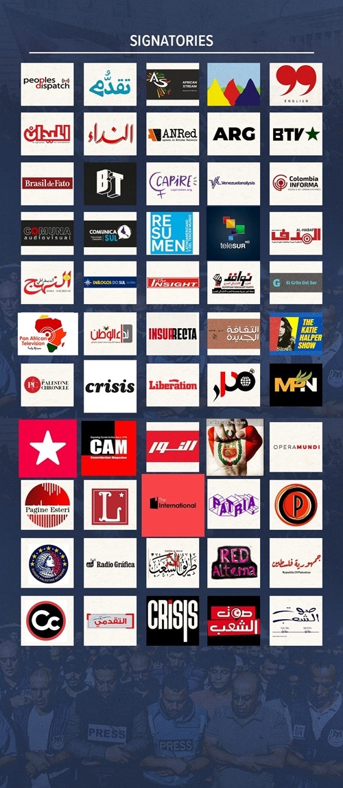 دفاعاً عن حرية الصحافة ضد القمع والاحتلال وما يتعرض له العديد من الصحفيين من قتل، وخطف، واعتقال وتضييق عليهم، في اليوم العالمي لحرية الصحافة، أصدرت 55 منصة إعلامية حول العالم من البرازيل، فنزويلا، الولايات المتحدة، كوبا، كولومبيا، بيرو، الأرجنتين، الأوروغواي، الاكوادور، لبنان، الكويت، فلسطين، العراق، المغرب، تونس، سورية، مصر، تركيا، الهند، غانا، كينيا، ايطاليا، الأردن، البحرين، السودان، وطالبت بوقف الإبادة الصهيونية في البيان التالي: