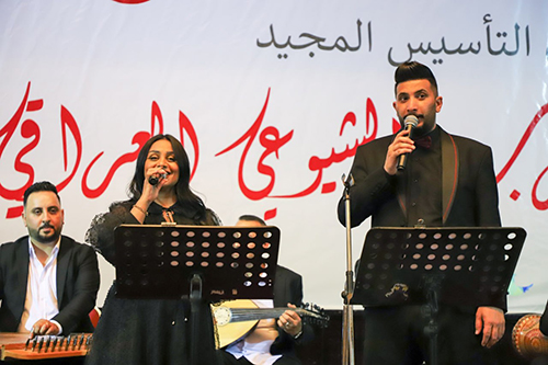 وإيذانا ببدء الحفل الفني الذي أحيته فرقة جمعية الموسيقيين العراقيين – المركز العام بقيادة المايسترو رؤوف عزيز محمد، صدحت حنجرة الفنان كريم الرسام رئيس الجمعية ومن رافقه من الفنانين والموسيقيين بخالدة مظفر النواب “جرح صويحب”، التي لاقت تفاعلا كبيرا من قبل المحتفلين بعيدهم.