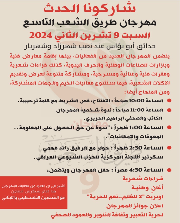 برنامج مهرجان طريق الشعب التاسع التفاصيل طريق الشعب من الحزب 07 تشرين2/نوفمبر 2024 3052 السابق التالي