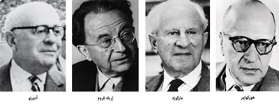 الحقيقة أننا من أجل أخذ فكرة أولية عن التنوع المعرفي والفكري لمدرسة فرانكفورت هذه، قد يكون حسبنا أن نذكر أن الأعلام الأربعة الأساسيين فيها، في مرحلتها الذهبية (بين أواخر العشرينيات وأواخر الثلاثينيات من القرن المنصرم) كانوا، على تقاربهم، ذوي اتجاهات متباعدة ومتكاملة، هوركهايمر كان فيلسوفاً، وماركوزه أقرب إلى علم الاجتماع وعلم الإيديولوجيا مع إطلالة أكيدة على علم النفس. وفيما كان إريك فروم عالم نفس ورث الفرويدية في توجه ماركسي واضح، كان جلّ عمل ثيودور أدورنو منصباً على نظرية الفن وعلم الجمال، وهو الذي كانت أشغاله النظرية حول الموسيقى الحديثة (أعمال شونبرغ وآلبن برغ) من أهم الأعمال التي تناولت هذه الموسيقى.