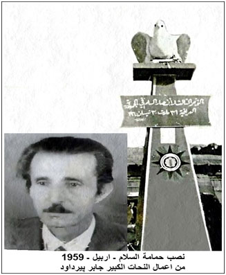 قام النحات الاربيلي المعروف الاستاذ( جابر بيرداود اسماعيل ـ ابو ژيان )(1 ) ببناء تمثال( حمامة السلام البيضاء) في عام 1959 في قلب مدينة اربيل ( غرب القلعة ) وسط ساحة اُطلق عليها اسم ( ساحة السلام او ساحة حمامة السلام ) وما تزال هذه التسمية شائعة حتى الان لدى عامة الناس في مدينة اربيل ,ومن الجدير بالذكر ان الفنان ( جابر بيرداود) استلهم فكرة انشاء تمثال ( حمامة السلام ) من (حمامة السلام البيضاء التي رسمها بيكاسو ) عام 1949، والتي اصبحت شعارا للمؤتمر العالمي لمناصري السلام الذي أنعقد بتاريخ 20 ولغاية 25 نيسان من عام 1949 في باريس وبراغ والتي أصبحت منذ ذلك الحين رمزا لحركة السلام , الا ان (حمامة )النحات الاربيلي (جابر بيرداود اسماعيل)كانت حمامة جاثمة على الأرض(غير طائرة) وضعت على قاعدة مربعة ارتفاعها اكثر من ( 13 )م (متسعة الأَسفل ضيقة الأَعلى), من الجدير بالذكر إن قاعدة النصب صممت بشكل هندسي من قبل المناضل المهندس الاربيلي المعروف ( هاشم عبدلله قادرالجلبي )(2 ), وقد تكفل بجميع مصاريف صنع التمثال المذكور ونصبه، كل من المقاول ( المناضل شريف جامباز والذي كان عضوا بارزا في منظمة انصار السلام) وشريكه المناضل المقاول( فائق نادر ) , وبعد انجاز العمل نصبت (حمامة السلام ) فى أكبر ميادين اربيل , ومنذ ذالك الوقت عرفت الساحة بـ( ساحة حمامة السلام ) .