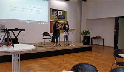 وعٌرض على الشاشة " النشيد الوطني المقترح لقصيدة الجواهري " سلامٌ على هضباتِ العراقُ ...وشطيّه والجُرف والمنحنى " ، وأغنية "سلام على دار السلام" للفنانة "لطيفة" وعازف العود المبدع "نصير شمه" وأنشودة "اين حقي" لاقت استحسان الجمهور، وعرض ايضا شريط من الصور والبوسترات حول المناسبة .وألقى الشاعر علي سلمان القادم من بغداد بعضا من قصائده الوطنية الجميلة التي الهبت حماس الحضور.