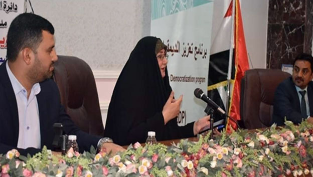 وقدمت سكرتيرة فرع رابطة المرأة صبيحة هاشم زهيان، خلال البرنامج، عرضا لسبل تعزيز الديمقراطية في العراق.