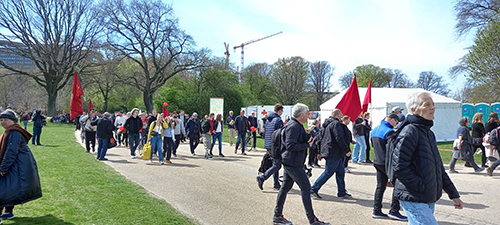 منذ الصباح الباكر، ومنظمات المجتمع المدني والاحزاب الشيوعية واليسارية الدنماركية وغير الدنماركية تنشط في الساحة الخضراء ((fælledparken)) المخصصة للاحتفال بعيد الطبقة العاملة العالمي في العاصمة كوبنهاكن. فكانت الاعلام الحمراء التي تحمل شعار المنجل والجاكوج عالية خفاقة فوق الخيم التي ازدانت طاولاتها وجدرانها بالمطبوعات والمنشورات والشعارات والبيانات المختلفة والمتنوعة وبلغات عدة، والتي اجمعت على رفض الحروب، وإحلال السلام والاستقرار في مناطق العالم جميعا، والمطالبة بحقوق العمال والكادحين في العيش الكريم.