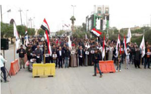 وقال مراسل "طريق الشعب" ان "المتظاهرين حملوا شعارات علقت عليها صورة الشهيد علي نازك، الذي استشهد قبل عام في تظاهرة سلمية في ساحة التحرير".